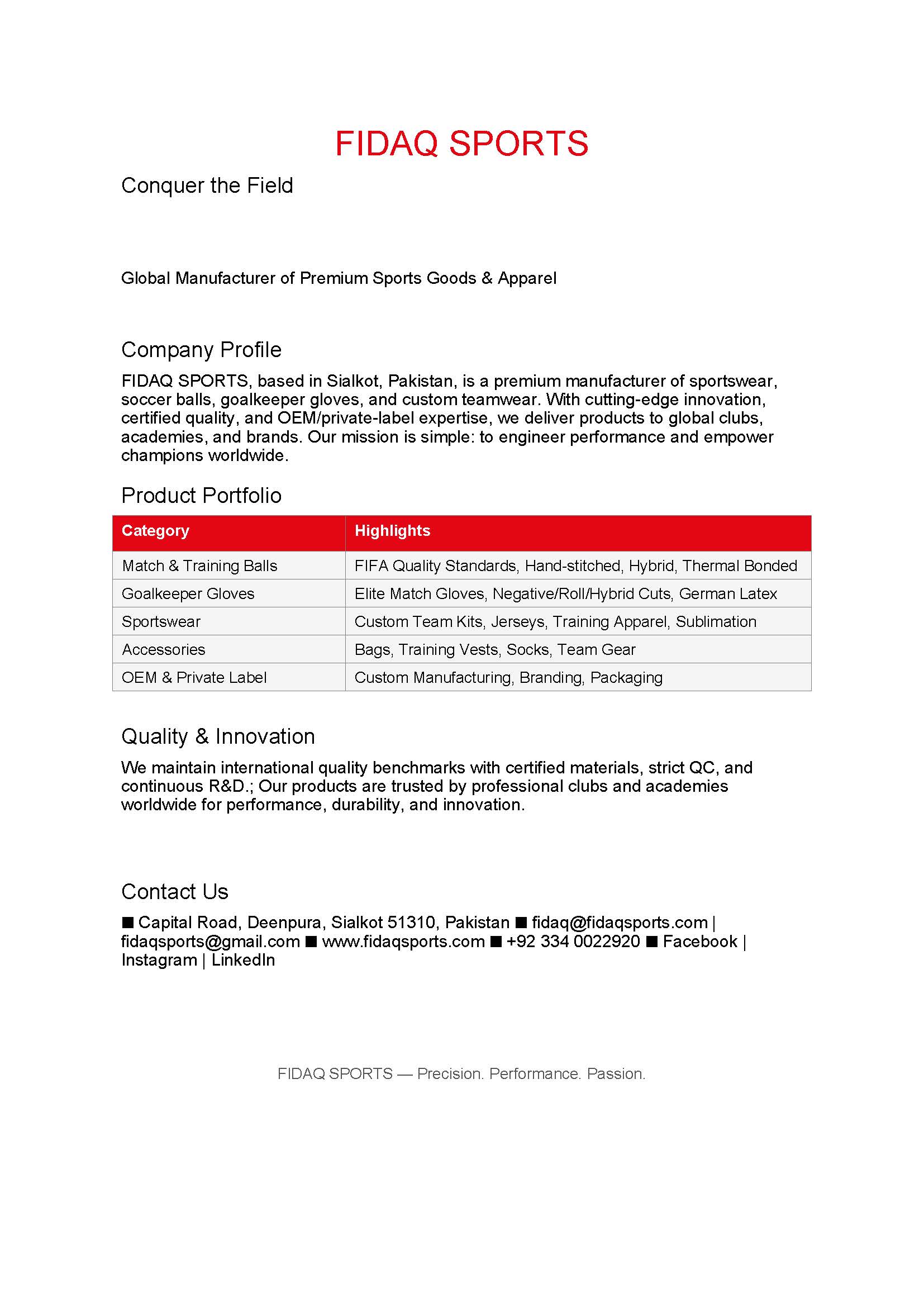 FIDAQ SPORTS is a globally trusted manufacturer and exporter of premium sportswear, equipment, and apparel, proudly based in Sialkot, Pakistan. With expertise and innovation, we deliver products that combine precision, performance, and durability — empowering athletes, clubs, and brands worldwide. We specialize in soccer balls, futsal balls, handball, volleyball, rugby ball, goalkeeper gloves, sportswear, and customized team kits, produced under strict international quality standards.