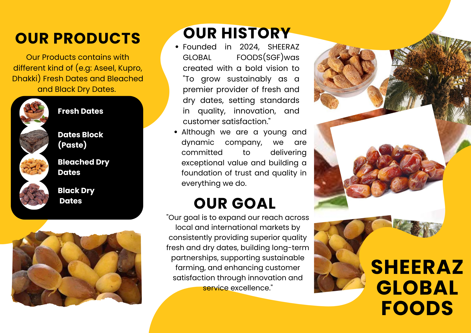 Sheeraz Global Foods is a Pakistan-based agribusiness specializing in premium quality dates and value-added products. Based in Khairpur, Sindh, the heart of Pakistan’s date industry, we offer Fresh Dates, Dry Dates, and Date Blocks (Paste) to both local and international markets. Our operations follow strict Halal, HACCP, and ISO quality standards to ensure purity and excellence.