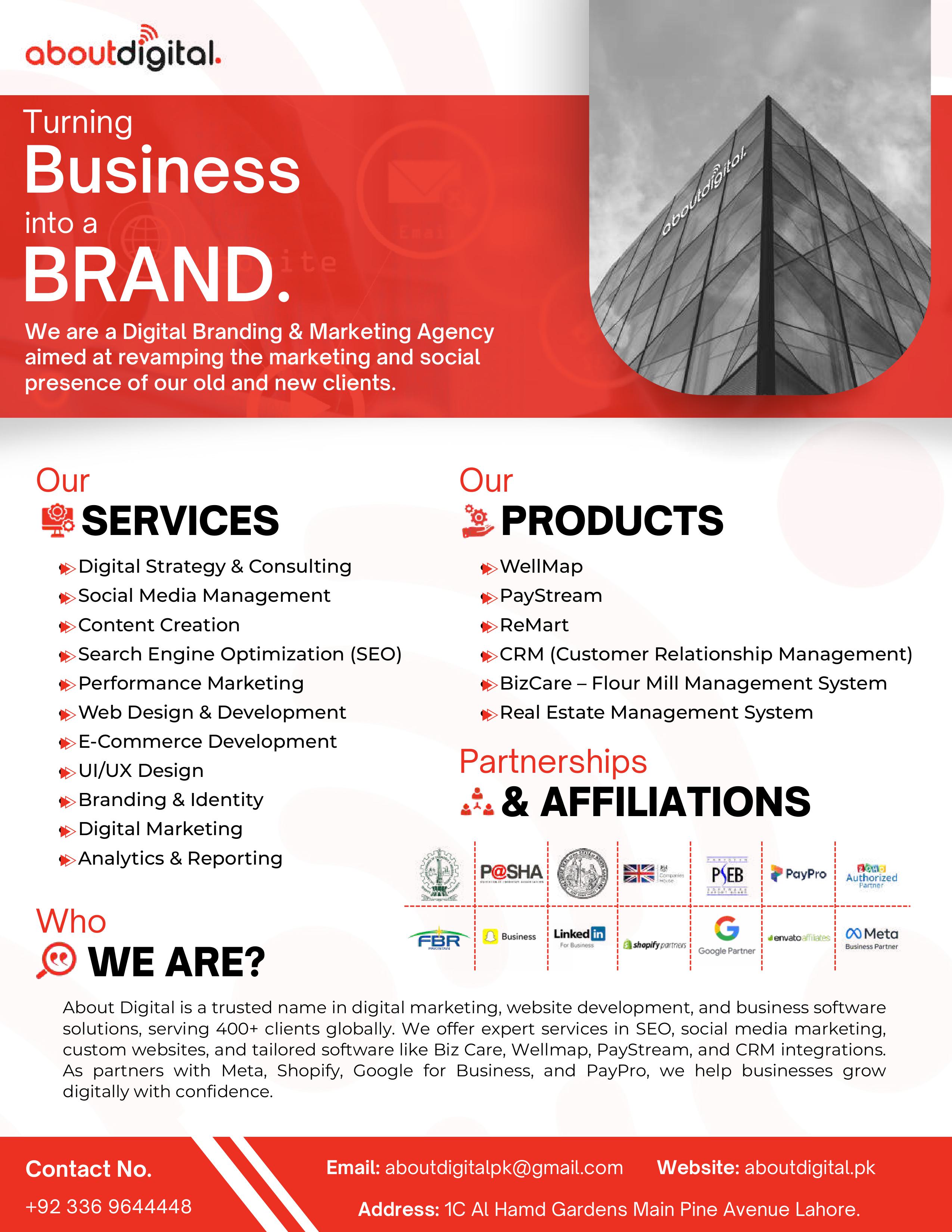 About Digital is a dynamic IT and digital solutions company committed to driving business growth through technology. We specialize in delivering high-quality digital marketing services and customized software products, including WellMap, CRM, PayStream, Remart, and BizCare (our flour mill management system). Our focus is on creating practical, scalable solutions that help our clients streamline operations, improve efficiency, and achieve their goals.
