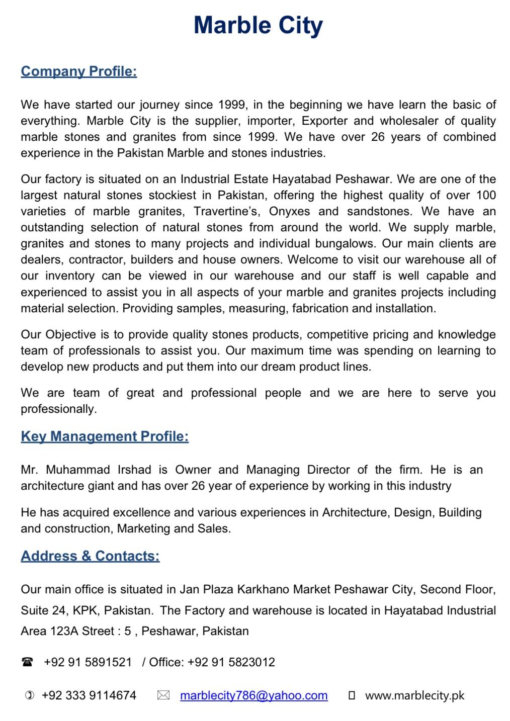 Marble City Company Profile: We have started our journey since 2002, in the beginning we have learn the basic of everything. Marble City is the supplier, importer, Exporter and wholesaler of quality marble stones and granite from since 2002. We have over 23 years of combined experience in the Pakistan Marble and stones industries. Our factory is situated on an Industrial Estate Hayatabad Peshawar. We are one of the largest natural stones stockiest in Pakistan, offering the highest quality of over 100 varieties of marble granite, Travertine’s, Onyxes and sandstone. We have an outstanding selection of natural stones from around the world. We supply marble, granite and stones to many projects and individual bungalows. Our main clients are dealers, contractor, builders and house owners. Welcome to visit our warehouse all of our inventory can be viewed in our warehouse and our staff is well capable and experienced to assist you in all aspects of your marble and granite projects including material selection. Providing samples, measuring, fabrication and installation. Our Objective is to provide quality stones products, competitive pricing and knowledge team of professionals to assist you. Our maximum time was spending on learning to develop new products and put them into our dream product lines. We are team of great and professional people and we are here to serve you professionally. Key Management Profile: Mr. Muhammad Irshad is Owner and Managing Director of the firm. He is an architecture giant and has over 23 year of experience by working in this industry He has acquired excellence and various experiences in Architecture, Design, Building and construction, Marketing and Sales. Address & Contacts: Our main office is situated in Jan Plaza Karkhano Market Peshawar City, Second Floor, Suite 24, KPK, Pakistan. The Factory and warehouse is located in Hayatabad Industrial Area 123A Street : 5 , Peshawar, Pakistan +92 91 5891521 / Office: +92 91 5823012 +92 333 9114674 [email protected] www.marblecity.pk